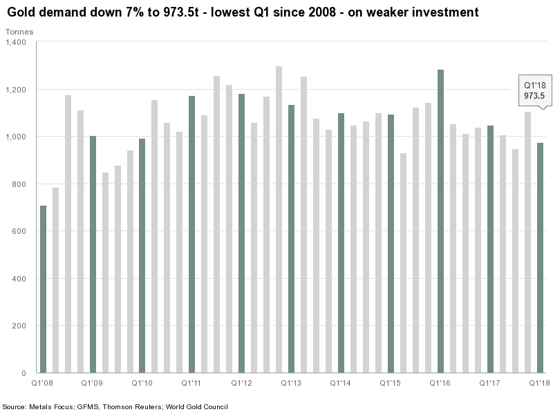 Laut den Zahlen des World Gold Councils (WGC) sank die weltweite Goldnachfrage im ersten Quartal 2018 auf 973,5 Tonnen. Gegenüber Vorquartal wird ein Rückgang um 12 Prozent gemeldet. Im Vergleich zum gleichen Vorjahresquartal fiel die Goldnachfrage demnach 7 Prozent niedriger aus.