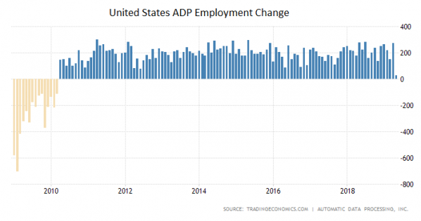 Am heutigen Mittwoch um 14:15 Uhr wurde der US-Arbeitsmarktbericht des privaten Arbeitsvermittlers ADP veröffentlicht. Er enthält Zahlen zur Veränderung der Arbeitsverhältnisse (Kündigungen, Neueinstellungen, Jobwechsel etc.) im Privatsektor per Ende Mai 2019. Demnach wurden im vergangenen Monat in den USA nur 27.000 neue Jobs außerhalb der Landwirtschaft geschaffen. Analysten hatten mit einem Plus von 180.000 Stellen gerechnet. Der Vormonatswert wurde zudem um 4.000 Stellen auf 271.000 nach unten revidiert. Zugleich brachte der Mai das niedrigste Jobwachstum im Rahmen des monatlichen ADP-Berichts seit März 2010. Am kommenden Freitag erscheint der offizielle Arbeitsmarktbericht der USA („Non-farm Payrolls“). Der Goldpreis legte nach Bekanntgabe der Zahlen weiter zu. Um 14:30 Uhr kostete die Feinunze Gold am Spotmarkt 1.342 US-Dollar (1.188 Euro). Mehr