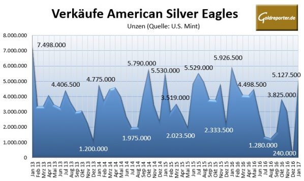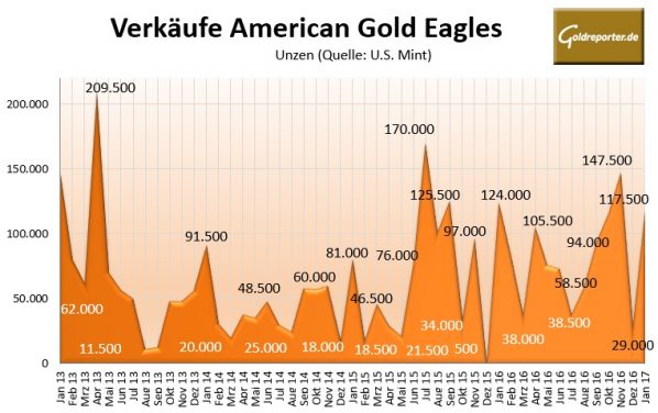 „Obwohl der Verkaufs-Start der (neuen) American Eagle Platinum 1-Unzen-Version erst am 23. Januar 2017 erfolgte, wurden bis Ende Januar bereits 30.000 Münzen verkauft… “
