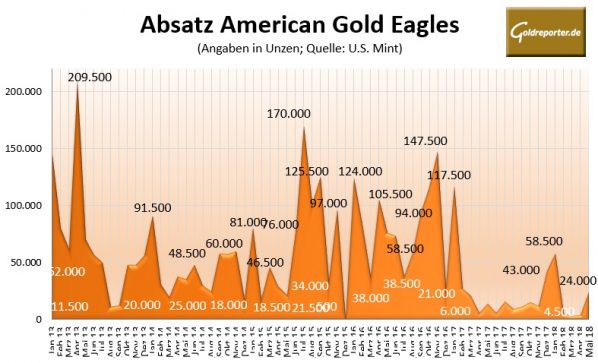 Das entspricht einer Steigerung um 433 Prozent gegenüber Vormonat und einem Plus von 65 Prozent im Vorjahresvergleich. Im Zeitraum von Januar bis Mai liegen die Gold-Eagle-Verkäufe mit 96.000 Unzen aber 48 Prozent unter Vorjahr.