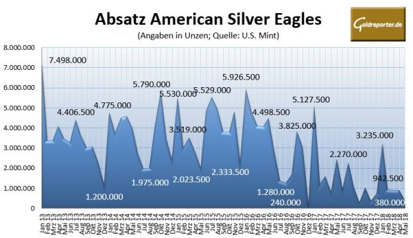 Stark eingebrochen ist der Silber-Absatz. So wurden laut U.S. Mint im Mai nur 380.000 Unzen der Anlagemünze American Silver Eagle verkauft – 58 Prozent weniger als im Vormonat und 84 Prozent weniger als im Mai 2017. Die 5-Monats-Jahren liegen mit 6.387.500 Unzen 43 Prozent unter Vorjahr.