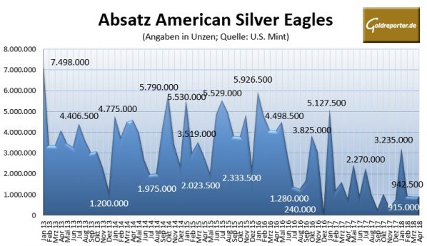 Das Ergebnis lag zwar über den 3.500 Unzen des Vormonats. Es war jedoch der dritte Monat in Folge mit lediglich vierstelligen Unzen-Verkäufen. Und im Vergleich zum April 2017 wurde ein Viertel weniger Gold abgesetzt. Im Zeitraum von Januar bis April rangierten die Gold-Eagle-Verkäufe 58 Prozent unter Vorjahr. Hinzu kamen aber noch 2.000 Unzen in Form der Goldanlagemünze American Buffalo.