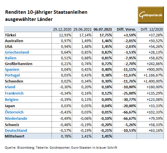 So rentierten 10-jährige US-Papiere am Vormittag mit 1,45 Prozent und damit 0,03 Prozentpunkte weniger als in der Vorwoche. Am 8. Juni hatte der Wert noch bei 1,56 Prozent gelegen. Auch die Renditen deutsche Staatsanleihen sind im Rahmen unserer wöchentlichen Erhebung mit -0,21 Prozent auf den tiefsten Stand seit drei Wochen gefallen.