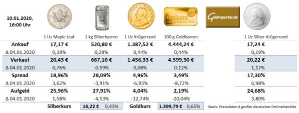 Die Lage im deutschen Edelmetall-Handel scheint sich nach dem großen Ansturm vor dem Jahreswechsel etwas zu entspannen. Zumindest ist das Aufgeld bei den meisten Anlageprodukten deutlich gesunken. Unsere aktuelle Erhebung wies bei Krügerrand-Goldmünzen zu einer Unze ein durchschnittliches Aufgeld von 4,04 Prozent aus. Gegenüber Vorwoche ist dieser Aufschlag auf den aktuellen Goldkurs beim Kauf von Krügerrand-Goldmünzen in unserer Marktbeobachtung um fast 13 Prozent zurückgegangen.