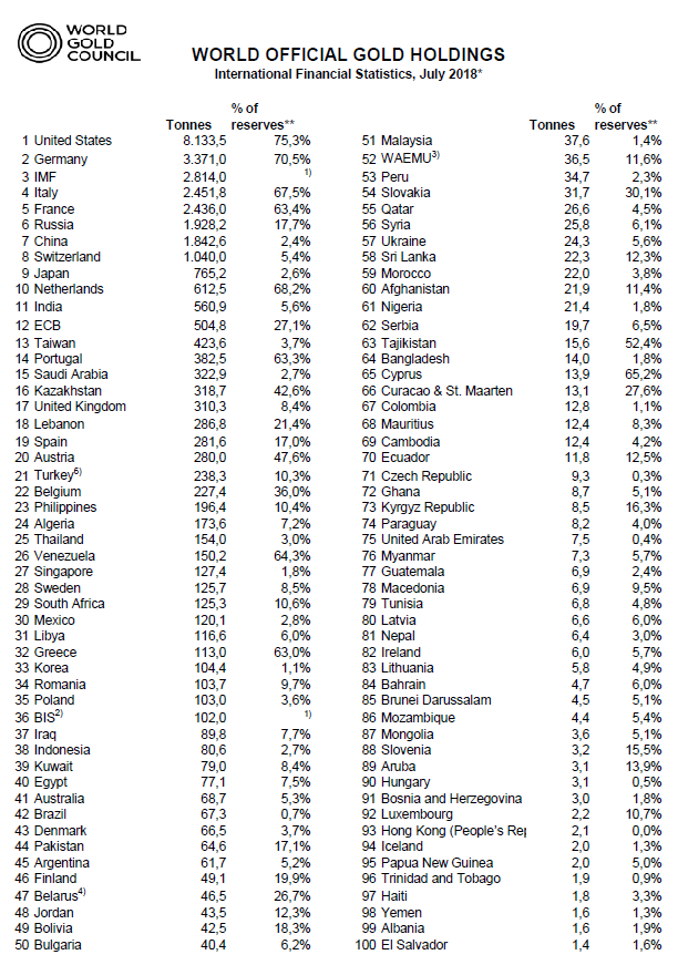 Weltweite Goldreserven 07-2018