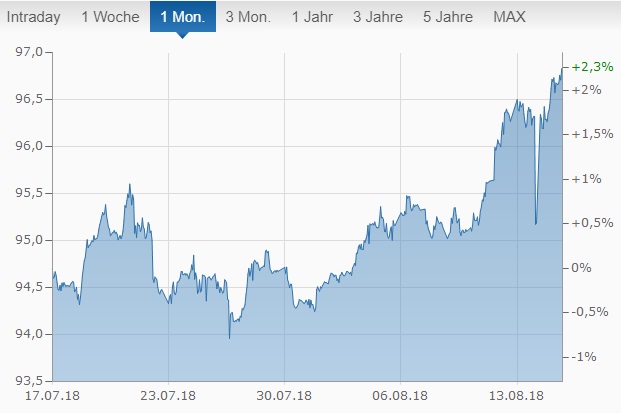 Im Zuge der Türkei-Krise kann es im Rahmen von Liquiditätsengpässen bei einigen Banken außerdem zu Notverkäufen kommen, die auch Gold und Silber belasten oder gar betreffen können. US-Dollar sind gefragt. Der Greenback wertet auf, was Gold und Silber traditionell unter Druck setzt. Der US-Dollar-Index (Warenkorb bedeutender Leitwährungen gemessen in US-Dollar) ist innerhalb eines Monat um gut 2,5 Prozent gestiegen. Der Euro wertete seit Monatsbeginn gegenüber dem US-Dollar um 2 Prozent ab.