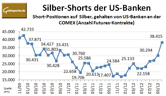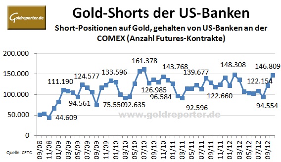 Im Einzelnen: Mit 146.809 Kontrakten auf Gold steigerten die US-Banken ihre Short-Positionen per 02.10.12 gegenüber dem Vormonat um 20 Prozent. Aber: Zwanzig Nicht-US-Banken vereinten auf sich Short-Positionen auf Gold im Umfang von 113.445 Kontrakten. Gegenüber dem Vormonat entspricht dies einem Anstieg um 77 Prozent!