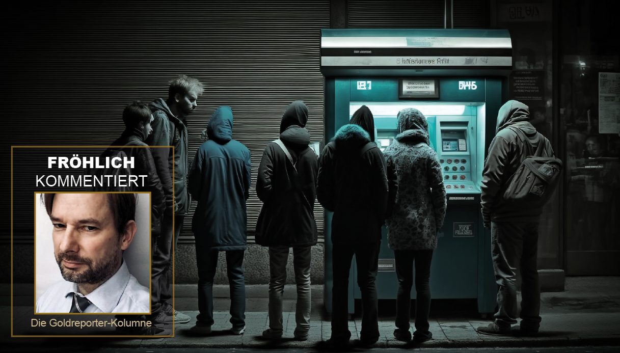 Angst vor Bankenansturm: Wenn die Kunden massenhaft ihre Konten leerräumen, ist staatliche Bankenrettung nicht weit. In einer Bankenkrise geht es vor allem um das Erhalten von Vertrauen. Dazu sind die Institutionen bereit, die Kaufkraft des Geldes weiter zu dezimieren (Bild: Goldreporter @midjourney).