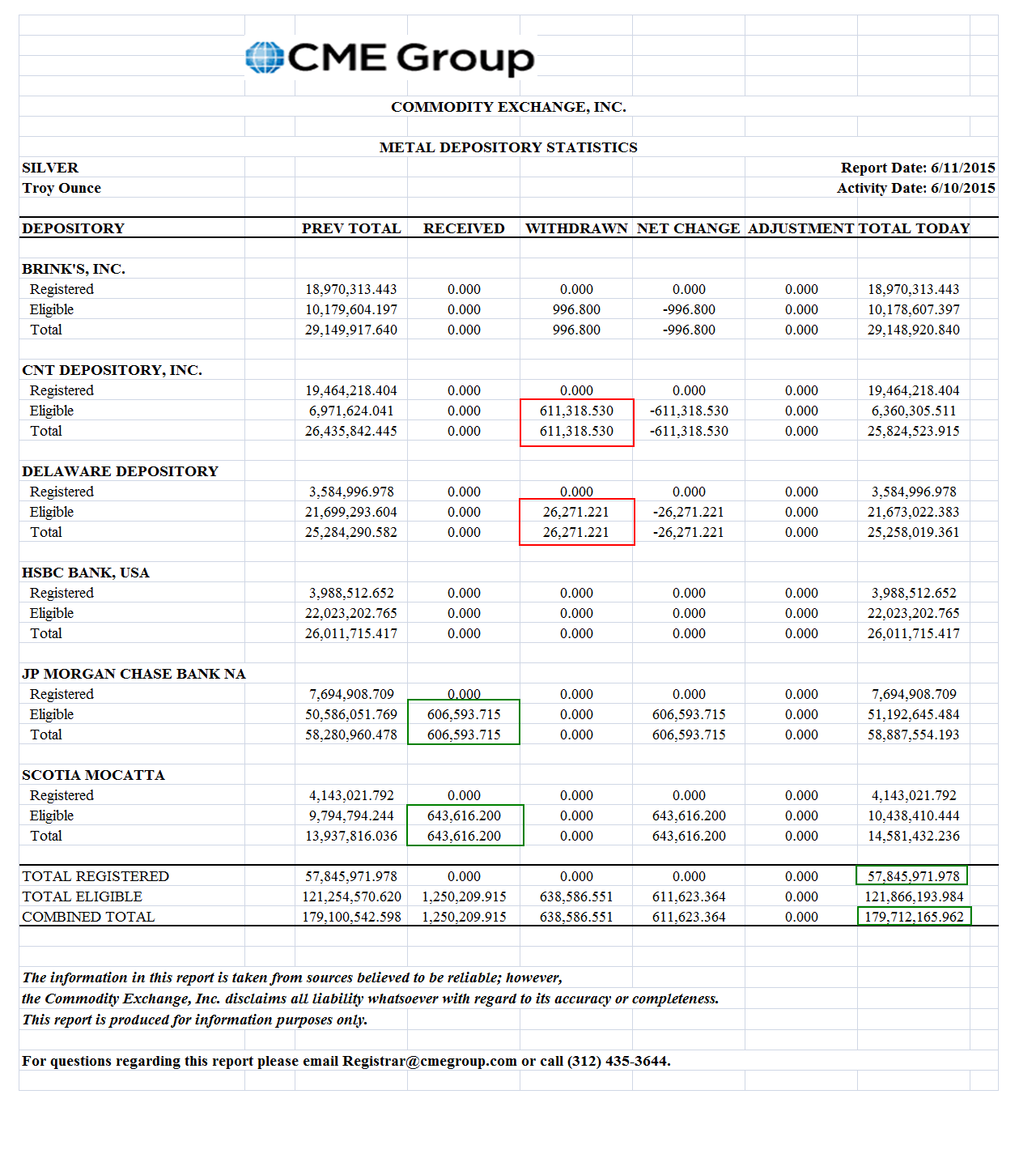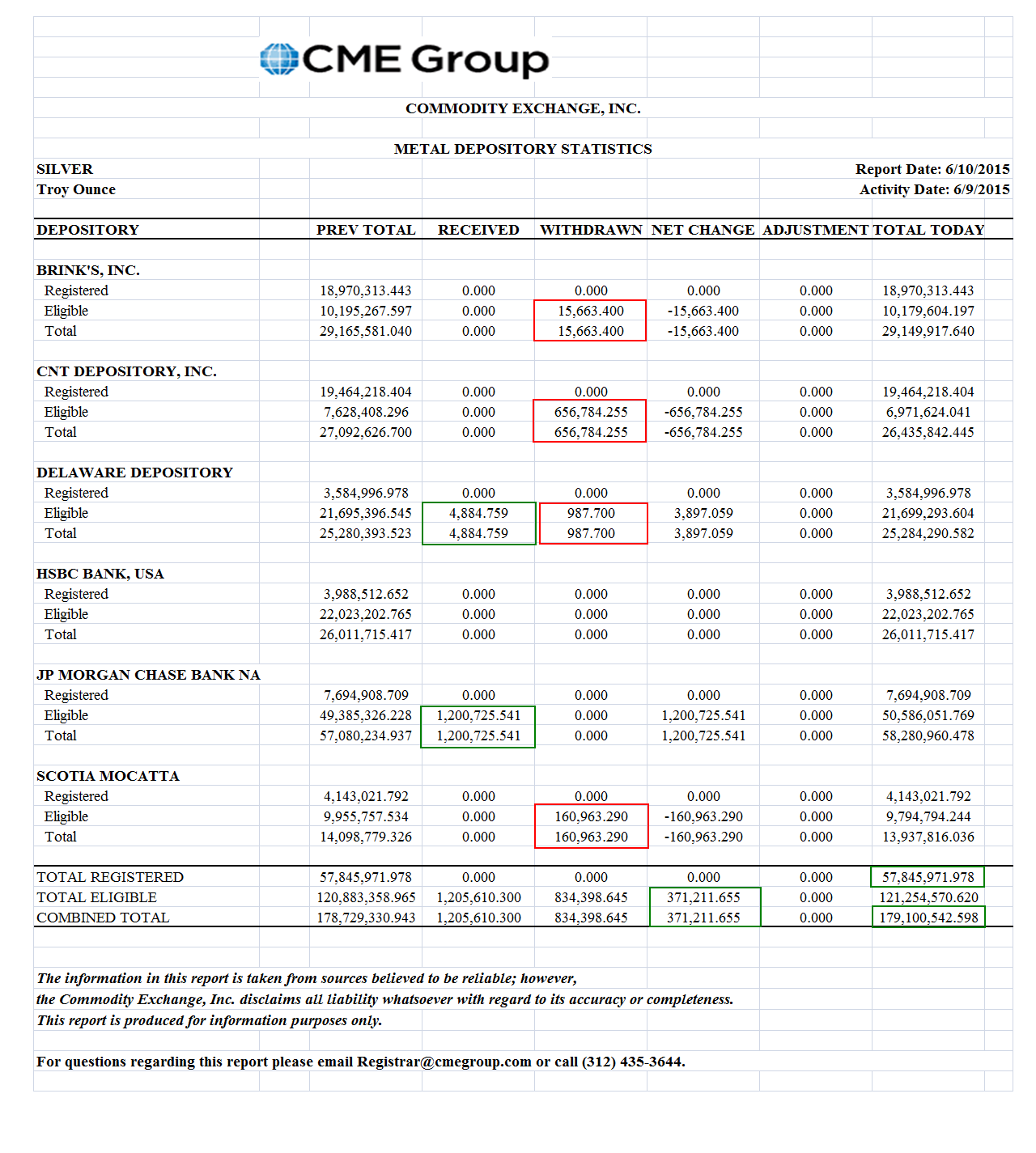 Bei der Bestandsaufnahme der Goldunzen, welche die an der Comex-Terminbörse zugelassenen 6 Bullionbanken zur Abwicklung von Gold-Futurekontrakten mit Datum vom 10.6.2015 zur Verfügung haben, werden nur die ‚registrierten‘ Goldunzen gezählt.