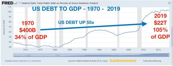 1971 lag die US-Verschuldung bei 400 Milliarden $, was 34 % des BIP entsprach. Heute stehen die US-Schulden bei 22 Billionen $, dem 55-fachen; das sind 105 % des BIP.