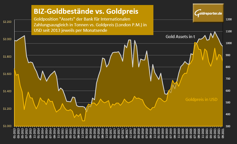 Und schon in den Sommermonaten sind die Gold-Positionen der BIZ stark gefallen, während der Goldpreis kräftig einbrach (War die BIZ am Goldpreis-Crash beteiligt?).