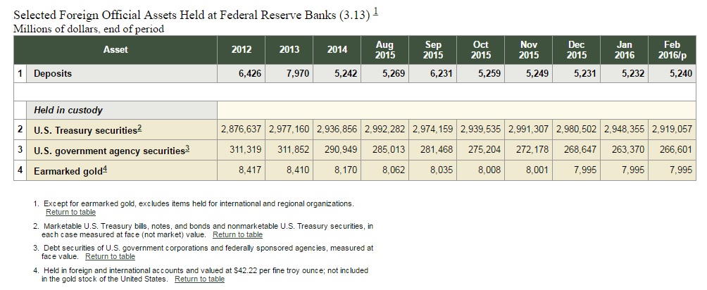 Demnach war im Februar so genanntes „Earmarked Gold“ im Wert von 7,995 Milliarden US-Dollar in den Kellern in Manhattan gelagert. Dieser Wert ist seit Dezember 2015 unverändert. Dabei handelt es sich definitionsgemäß um Gold, dass die Fed im Auftrag ausländischer Kunden verwahrt.