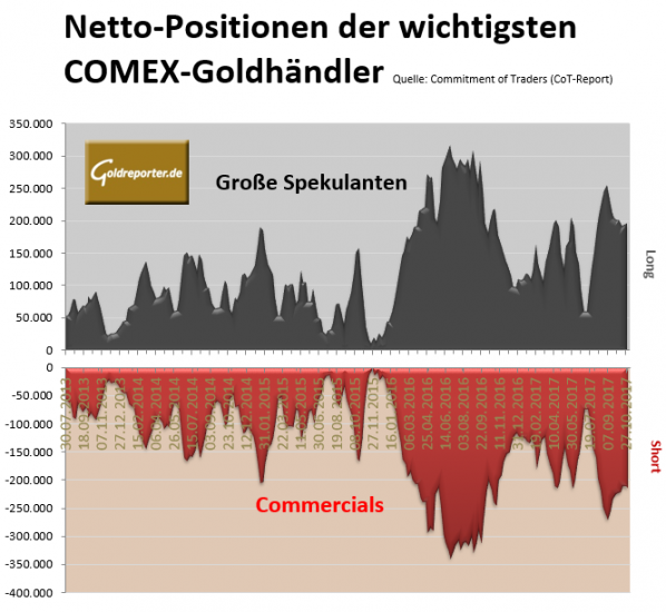 Die Netto-Short-Position der „Commercials“ hat sich um 2,2 Prozent auf 215.287 Kontrakte erhöht. Die Untergruppe der „Swap Dealers“ (darunter die Großbanken) baute ihre Verkaufsposition netto sogar um 27 Prozent auf 34.213 Kontrakte aus.
