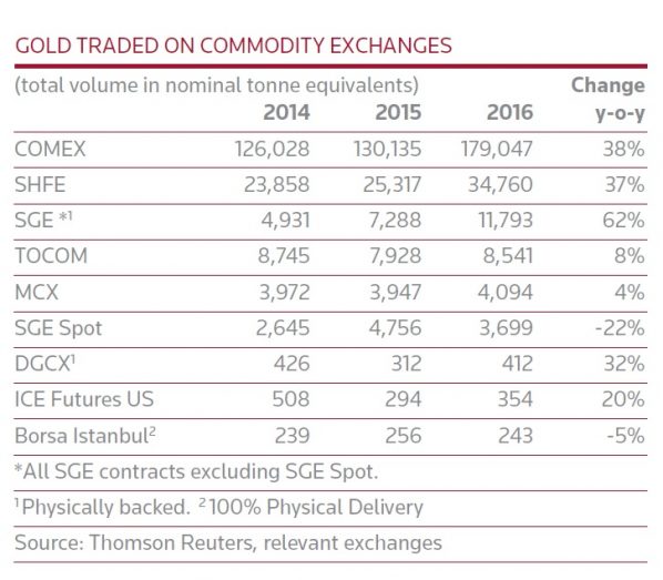 Die US-Warenterminbörse COMEX war demnach auch 2016 die weltweit größte Goldbörse auf Basis des jährlichen Handelsvolumens. So wurden hier innerhalb von zwölf Monaten insgesamt 179.947 Tonnen Gold gehandelt, 38 Prozent mehr als im Vorjahr.