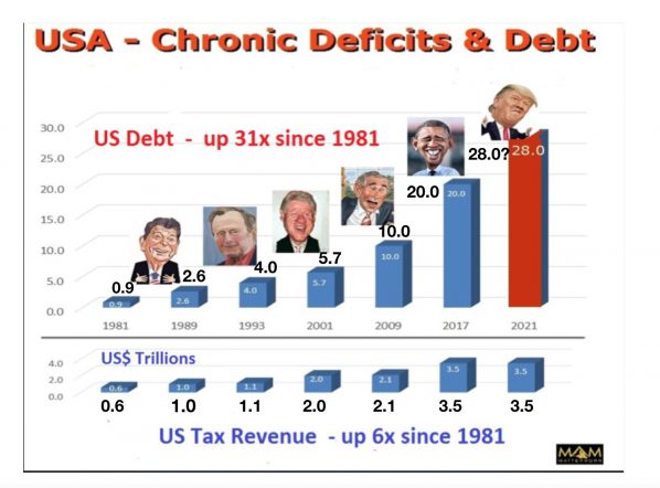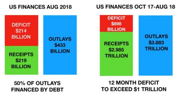 Ob die Verschuldung bis 2021 – also auf halbem Weg – 28 Billionen Dollar erreichen wird, so wie ich prognostiziert hatte, werden wir früh genug erfahren. Das entspräche einem durchschnittlichen Monatsdefizit von 230 Milliarden $ für die kommenden 28 Monate. Da das August-Defizit der USA schon bei 214 Milliarden $ lag, scheint diese Rechnung nicht allzu unrealistisch. Bekannt ist Folgendes: Schon jetzt steht die Verschuldung bei 21,5 Billionen $, oder aber 1,5 Billionen $ über dem Niveau, das vor dem Amtsantritt Trumps vor 19 Monaten herrschte. Und dabei befindet sich die US-Wirtschaft schon in einer Boom-Phase!