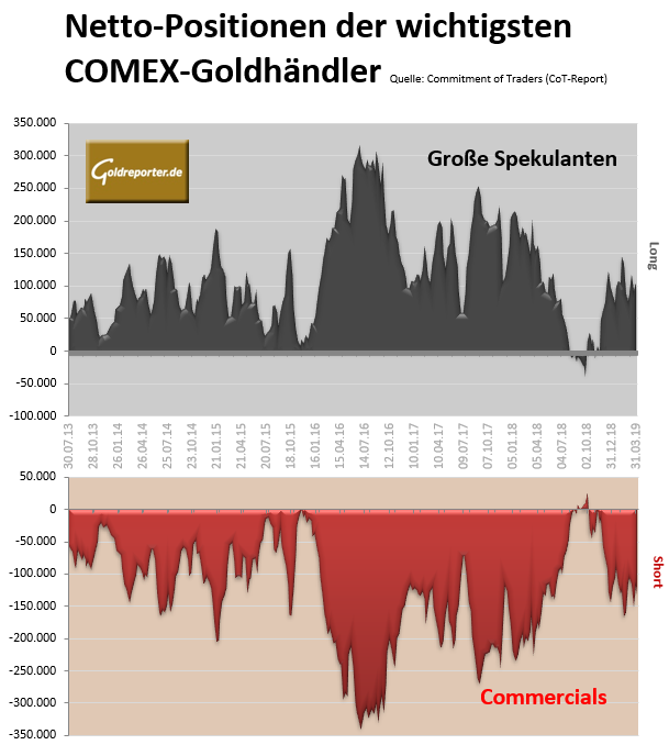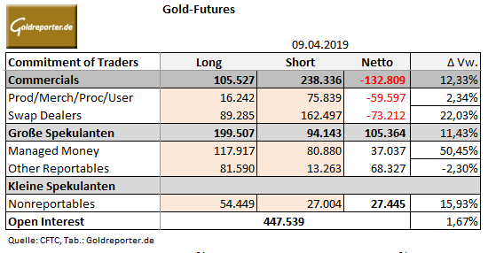 Die vergangene Handelswoche brachte für Gold erneut keine Impulse. Das Verhalten der großen Player auf dem Goldmarkt ist seit Wochen von deutlicher Sprunghaftigkeit geprägt. Die jüngsten CoT-Daten vom Handel mit Gold-Futures an der US-Warenterminbörse COMEX zeigen per 9. April 2019 folgende Veränderungen in den Positionen der bedeutendsten Händlergruppen.