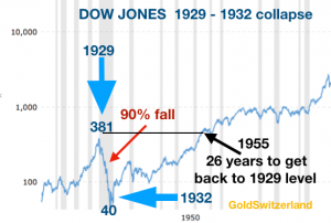 Sicher werden Zentralbanken in Panik verfallen und grenzenlos Geld drucken, aber die Märkte werden schnell merken, dass dieses Geld wertlos ist, weshalb es keinen Effekt mehr haben wird. Was Investoren auch nicht verstehen ist, dass es sehr lange dauern kann, bis Aktien nach einem großen Absturz wieder diesen steilen Berg hochgeklettert sind. 1929 war der Höchststand des Dow 481 Punkte bevor er innert weniger als 3 Jahren um 90% auf das Tief von 40 im Jahr 1932 fiel. Nur wenige wissen, dass es 26 Jahre dauerte, bis der Dow wieder auf den alten Höchststand von 1929 zurückkam.