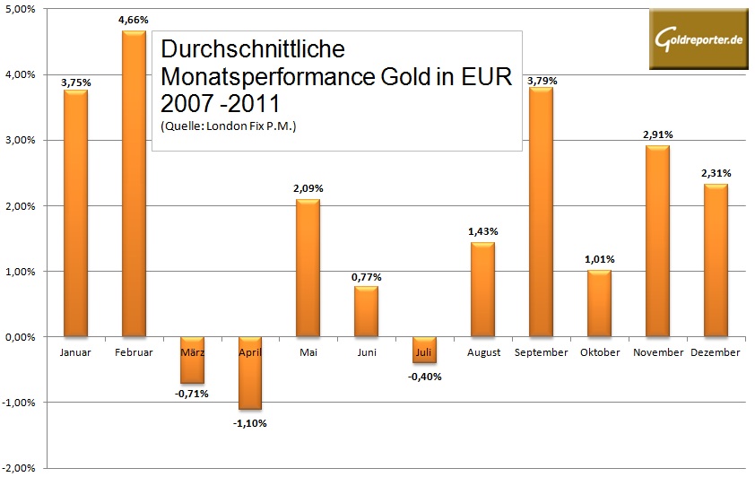 Goldreporter hat die Jahre 2007 bis 2011 nach saisonalen Goldpreis-Schwankungen untersucht. Daraus entstand die folgende Darstellung.