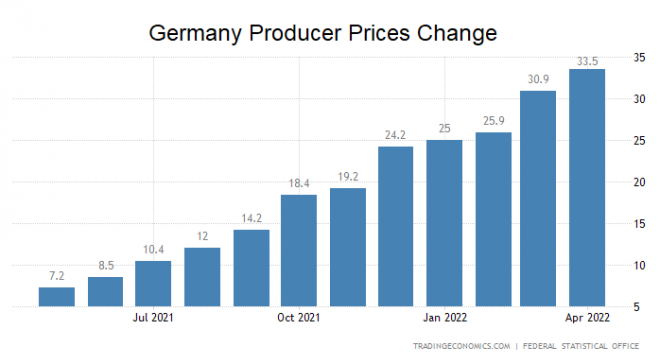 Kein Ende hoher Inflation in Sicht: Die deutschen Erzeugerpreise sind im April um 33,5 Prozent gegenüber Vorjahr angestiegen (Vormonat: +30,9 %). Gegenüber Vormonat wird ein Anstieg um 2,8 Prozent gemeldet. Analysten hatten ein Plus von 31,5 Prozent beziehungsweise nur 1,4 Prozent erwartet. Mehr