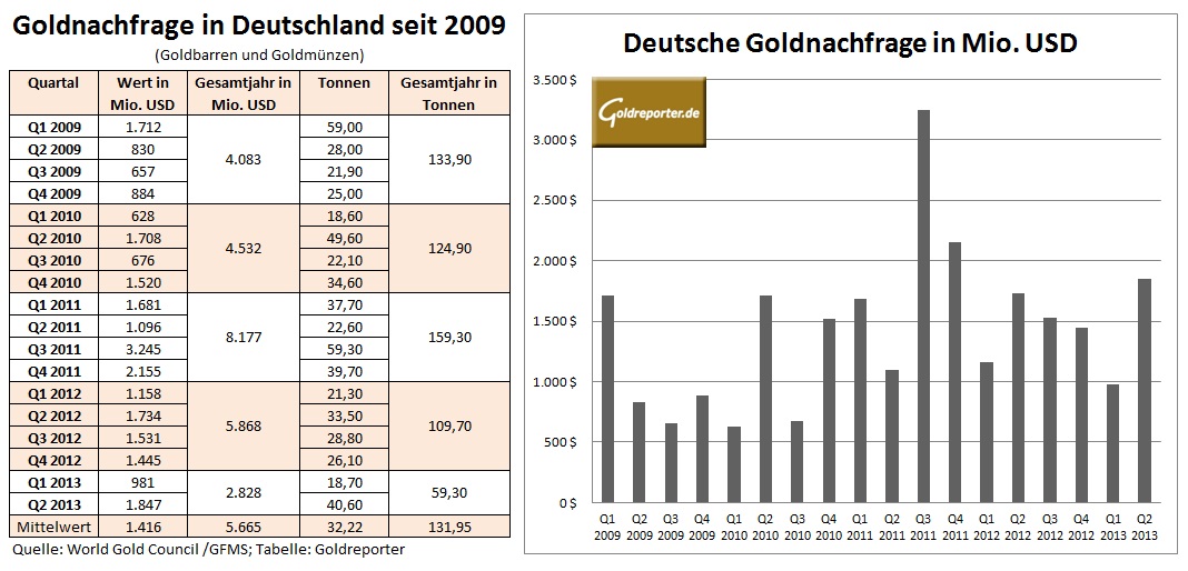 Deutschland rangierte im zweiten Quartal 2013 hinter China ($ 5,59 Mrd.) und Indien ($ 5,55 Mrd.) auf Platz drei der Länder mit den größten privaten Anlagegold-Investitionen. Danach folgten die Türkei ($ 1,72 Mrd.), Thailand ($ 1,17 Mrd.), die USA ($ 1,10 Mrd.) und die Schweiz ($ 929 Mio.).