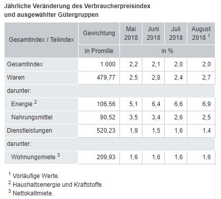 Das Statistische Bundesamt (Destatis) hat seine erste Schätzung für die August-Inflation in Deutschland veröffentlicht. Demnach sind die Konsumentenpreise (Verbraucherpreis-Index) gegenüber Vorjahr um 2,0 % gestiegen. Schon im Vormonat lag die offizielle deutsche Inflation auf diesem Niveau. Besonders stark gestiegen sind laut Destatis einmal mehr die Kosten für Energie (+6,9 %). Nahrungsmittel haben sich nur noch um 2,5 % verteuert. Die aktuellen Inflationszahlen lagen im Rahmen der Analystenerwartungen. Mehr