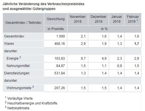Die Inflationsrate in Deutschland ist im Februar gegenüber Vormonat nur leicht angestiegen. Der Verbraucherpreisindex legte nach erster Schätzung des Statistischen Bundesamtes (Destatis) um 1,6 % gegenüber Vorjahr zu. Am stärksten verteuerte sich erneut der Faktor Energie (+2,9 %). Die offizielle Teuerung lag damit deutlich unter dem Ziel der Europäischen Zentralbank, die Werte um bzw. nahe 2 Prozent als ideal für die wirtschaftliche Entwicklung ansieht. Mehr