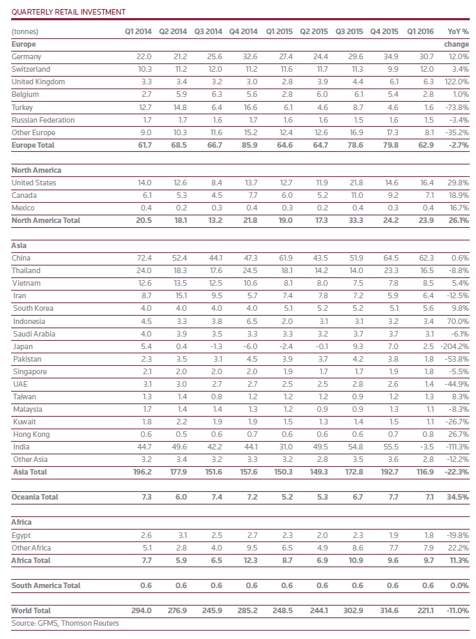 Im ersten Quartal 2016 war Deutschland hinter China mit 62,3 Tonnen zweigrößter nationaler Abnehmer von Anlagegold. Auf die USA entfielen 16,4 Tonnen an Goldmünzen und Goldbarren. Für die Schweiz werden 12 Tonnen ausgewiesen. Und Großbritannien verzeichnet mit 6,3 Tonnen eine um 122 Prozent höhere Anlagegold-Nachfrage als um Vorjahr. Vergleichen Sie dazu: HSBC: Goldpreis könnte bei Brexit explodieren