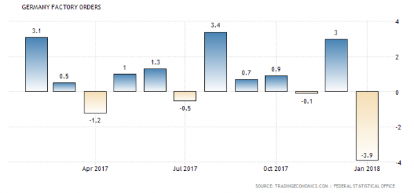 Das verarbeitende Gewerbe in Deutschland verbuchte im Januar 3,9 Prozent weniger Aufträge als im Vormonat. Das meldete das Statistische Bundesamt (Destatis) heute laut vorläufigen Angaben. Die Zahlen sind preis-, saison- und kalenderbereinigt. Analysten hatten einen Rückgang von lediglich 1,9 Prozent erwartet. Im Januar 2017 hatte es jedoch noch schwächere Zahlen gegeben. Gegenüber Vorjahr ergab sich somit nun ein Plus von 8,2 Prozent. Besonders stark sanken zuletzt die Aufträge aus der Eurozone. Sie gingen im Januar um 5,9 Prozent zurück. Mehr