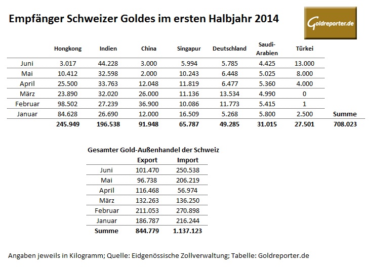 Nach Deutschland gingen im gleichen Zeitraum 49,29 Tonnen Gold. Diese Menge entspricht in starken Verkaufszeiten etwa einer deutschen Quartalsnachfrage (vgl. Q3 2013). Österreich erhielt in den ersten sechs Monaten 2014 lediglich 5 Tonnen Gold aus der Schweiz.