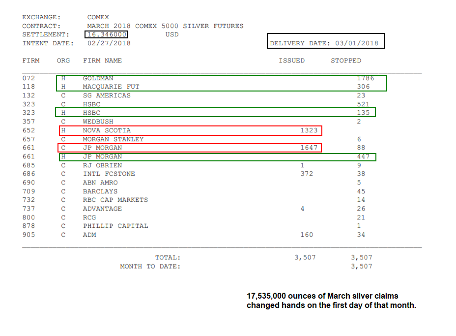 Aber nicht nur JP.Morgan, sondern auch die „Goldmänner“ verkaufen aktuell Gold und investieren es bei einem lächerlichen „Settlement-Preis“ (am 27.2.18) von $16,346/Unze zum 1. März in Silber: 1786 Silber-Kontrakte entsprechen 8 Millionen Neunhunderdreißigttausend Silber-Unzen.