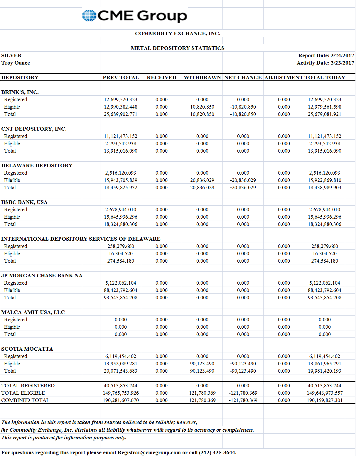 Wer Zugriff auf die Comex-Clearing-Daten hat, kann sehen, daß gestern 72.472 Silberfuture-Kontrakte ( =362.360.000 Unzen Silber) für den Termin Mai 2017 zu einem „Settlement“-Kurs von $18,252 „glattgestellt“ wurden; ein deutliches Zeichen, daß viele Händler ihre Verluste „begrenzen“ wollten, bevor das BREXIT-Drama verunsicherte Investoren in „Sichere Häfen“ treibt.