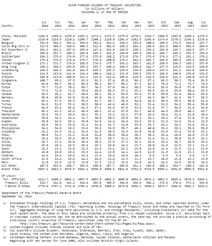 Auch bemerkenswert: Noch im Juli hat Russland seine Bestände an US-Staatsanleihen um 0,5 Prozent auf 114,5 Milliarden US-Dollar erhöht. Russland steht damit auf Platz 12 der größten US-Auslandsgläubiger. Im Oktober 2013 war man allerdings mit 149,9 Milliarden US-Dollar noch in den Top-10.