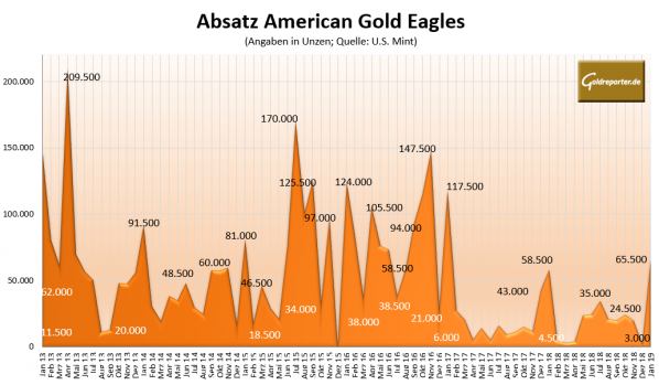 Der Hersteller der American-Eagle-Münzen hat im Januar so viel Gold und Silber abgesetzt wie zuletzt vor zwei Jahren.