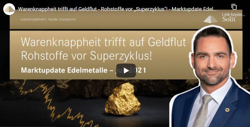 Die SOLIT-Gruppe hat ein Marktupdate zur Entwicklung der Edelmetalle und des Rohstoffsektors veröffentlicht. Es handelt sich um ein Webinar mit dem Titel „Warenknappheit trifft auf Geldflut – Rohstoffe vor Superzyklus“ (Video unten).