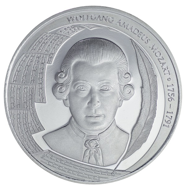 Auf der Vorderseite der Silber-Medaillen wird Mozart in der Frontansicht gezeigt, geziert von Notenblättern und einer Federkiel-Schreibfeder. Die Rückseite zeigt das Panorama der Altstadt von Salzburg.