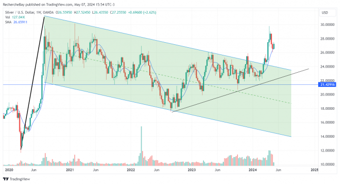 Aktuell setzt der Silberkurs noch seine Konsolidierungsphase fort. Obwohl die Marginanforderungen an den Terminmärkten dreimal innerhalb eines Monats angehoben wurden, hat der Futures-Kurs seine bullische Konfiguration im Wochenchart beibehalten. Der gleitende 10-Tages-Durchschnitt diente als Unterstützung, wobei die meisten Analysten eine deutlichere Korrektur und einen erneuten Test der Linie erwartet hatten, die den Ausbruch nach oben markierte.