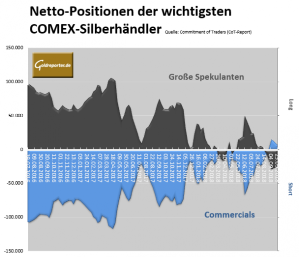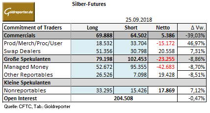 Betrachten wir dazu die CoT-Daten per 25. September 2018. Gegenüber Vorwoche ist die seit nunmehr fünf Wochen bestehende Netto-Long-Position der „Commercials“ um 39 Prozent auf 5.386 Kontrakte gesunken. Auf der anderen Seite ging die seit sieben Wochen bestehende Netto-Short-Position der „Großen Spekulanten“ nur um knapp 9 Prozent zurück auf 23.255 Kontrakte. Das „Managed Money“ (Hedgefonds, Investmentgesellschaften) hielt zu diesem Zeitpunkt immer noch Netto-Verkäufe von umgerechnet 6.637 Tonnen Silber in Form von Futures.