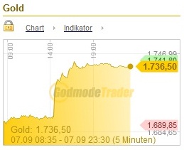 Das Edelmetall ging schließlich mit 1.736,50 Dollar aus dem Handel, ein Plus von 2 Prozent gegenüber dem Vortag (Deutsche-Bank-Indikation).
