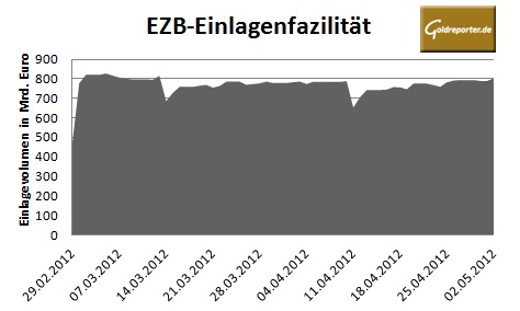 Die Übernachteinlagen der europäischen Geschäftsbanken bei der Europäischen Zentralbank sind am gestrigen Mittwoch erneut auf mehr als 800 Milliarden Euro angestiegen. In der so genannten Einlagenfazilität (Deposit Facility) befanden sich laut EZB-Angaben 803 Milliarden Euro. Die Gelder werden mit nur 0,25 Prozent verzinst. Die folgende Grafik zeigt die Entwicklung des Einlagevolumens seit dem 29. Februar 2012.