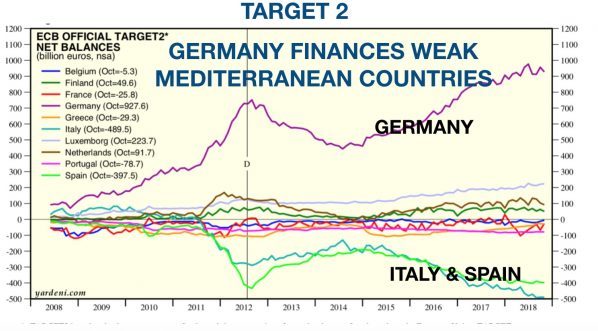Die Staatsschuldenquote von 130 %, die zweithöchste in der Eurozone (nach Griechenland) sowie Target-2-Kredite (Italiens Kredite finanziert von der Bundesbank via EZB) in Höhe von 500 Milliarden Euro… plus, plus, plus, werden Italien keine Chance beim Schuldendienst lassen. Seit 2015 sind die quantitativen Lockerungen der Eurozone auf 2,5 Billionen Euro angewachsen, und die EZB tritt buchstäblich als der einzige Käufer italienischer Schulden auf. Die Schuldverzinsung ist drastisch gestiegen und viele europäische Banken, besonders französische, sind davon deutlich betroffen.