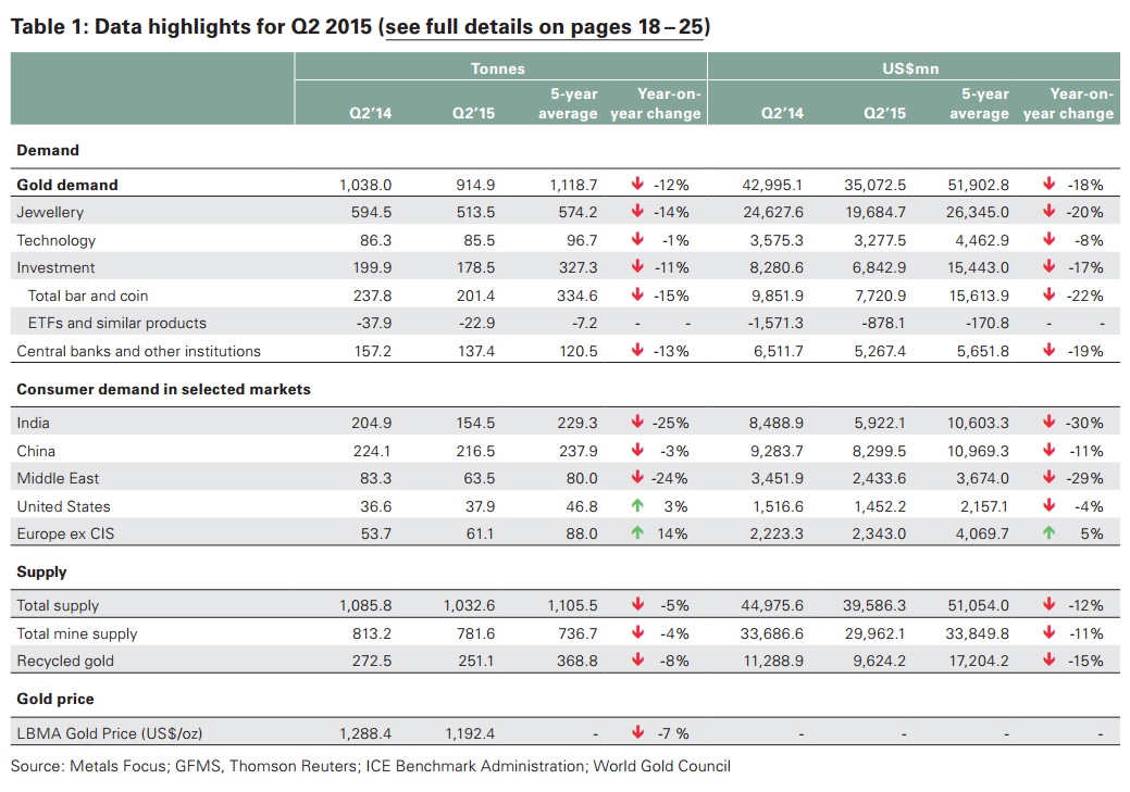 Der World Gold Council hat Marktdaten für das zweite Quartal 2015 veröffentlicht. Die Goldnachfrage hat im zweiten Quartal ein 6-Jahres-Tief erreicht.