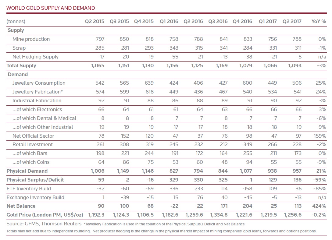 Für das erste Halbjahr 2017 ergibt sich aus den Zahlen mit 1.895 Tonnen ein Anstieg der physischen Goldnachfrage um 17 Prozent gegenüber Vorjahr. Das Goldangebot lag mit 2.160 Tonnen 5 Prozent unter dem 1. Halbjahr 2016.
