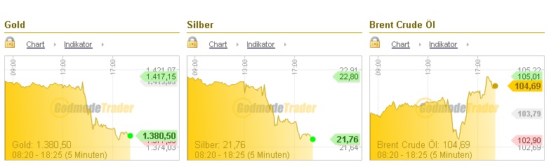 Gold notierte um die gleiche Zeit bei 1,381 Dollar und lag damit 37 Dollar hinter dem Tageshöchstkurs zurück. Bei Silber war es mit 21,77 Dollar je Feinunze rund 1 US-Dollar weniger.