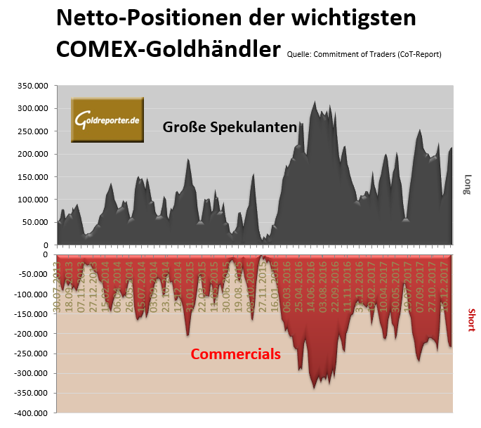 Die Netto-Short-Position der „Commercials“ ist um 0,88 Prozent gestiegen auf 234.552 Kontrakte. Jene der „Swap Dealers“ (darunter die Großbanken) sank sogar um 2,8 Prozent auf 41.301 Kontrakte.