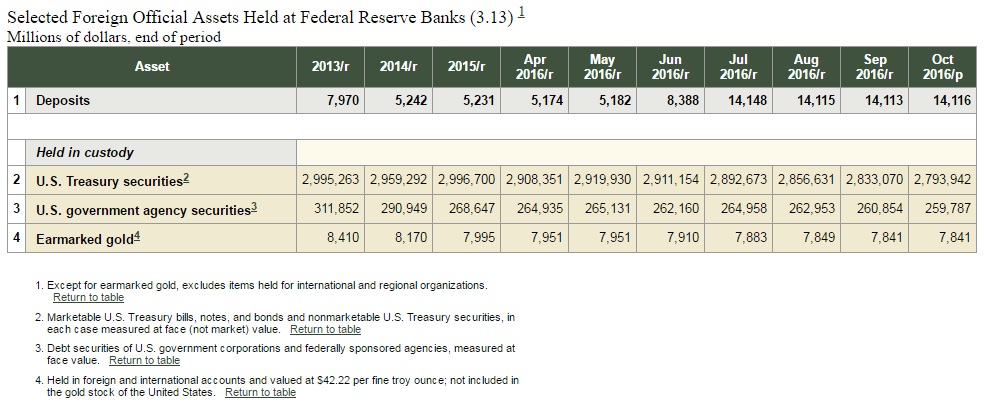 Der Wert der in fremdem Auftrag dort gelagerten Goldbestände („Earmarked Gold“) betrug laut den aktuellen Zahlen der Federal Reserve Bank of New York per 31. Oktober 7.841 Millionen US-Dollar. Bewertet wird dieses Gold traditionell zum Preis von 42,22 Dollar/Unze.