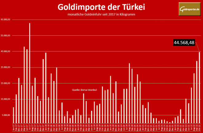 Die Türkei hat im vergangenen Monat 44,56 Tonnen Gold importiert. Damit holte das Land eine so große Goldmenge ins Land wie seit Januar 2018 nicht mehr. Zuletzt steigerte man die Goldeinfuhr vier Monate in Folge. Gegenüber September nahm das Einfuhrvolumen um 14 Prozent zu. Und im Vergleich zum Oktober 2021 fielen die türkischen Goldimporte sogar 37-mal höher aus (+3.572 Prozent).