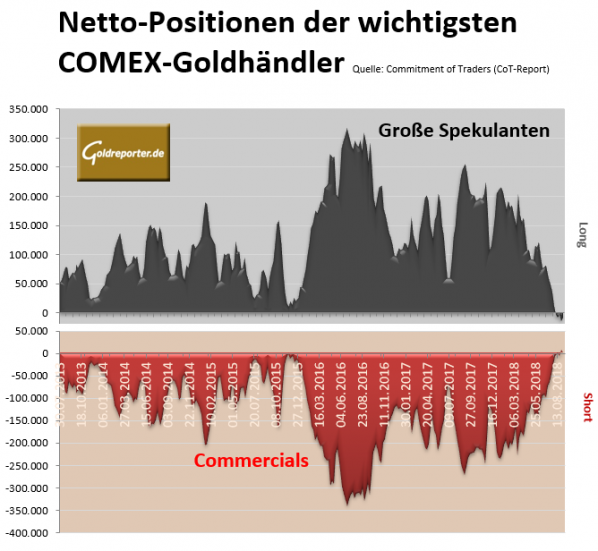Die jüngsten CoT-Zahlen vom Handel mit Gold-Futures an der US-Warenterminbörse COMEX zeigen per 11. September 2018 folgende Veränderungen in den Positionen der bedeutendsten Händlergruppen.