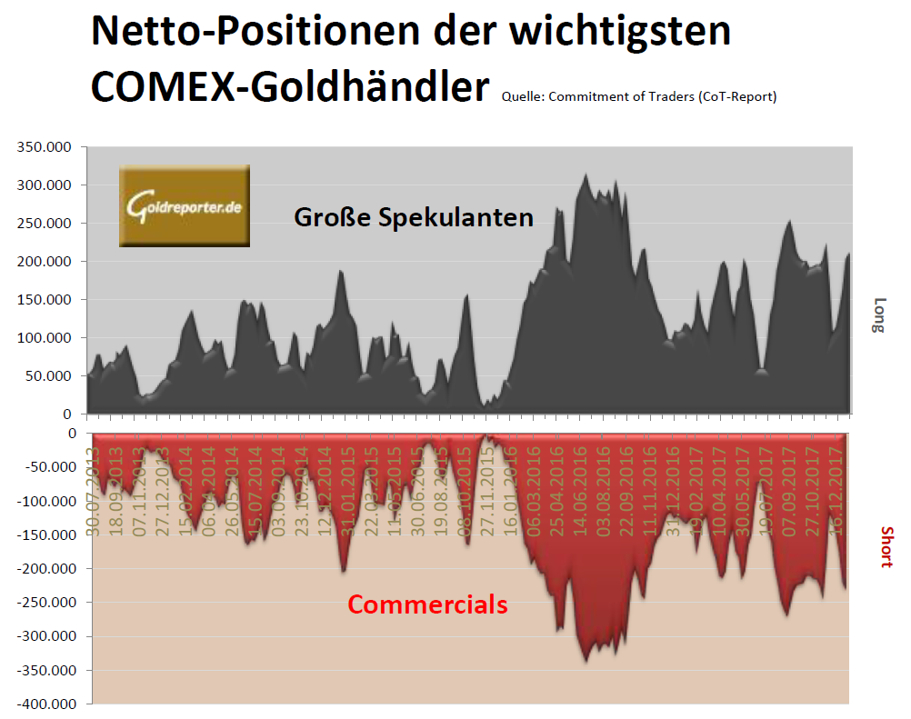 Die Netto-Short-Position der „Commercials“ ist um 5,55 Prozent auf 232.507 Kontrakte gestiegen. Die Kontraktzahl entspricht Terminverkäufen von 723 Tonnen Gold. Das ist der höchste Wert seit dem 28. November 2017.