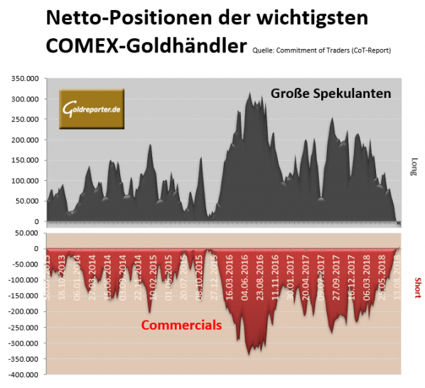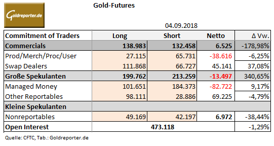 Die aktuellen CoT-Zahlen vom Handel mit Gold-Futures an der US-Warenterminbörse COMEX zeigen per 4. September 2018 folgende Veränderungen in den Positionen der bedeutendsten Händlergruppen.