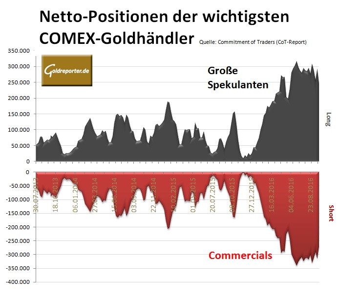 Ein Blick in die Goldreporter-Tabelle (oben) zeigt bereits für den COT-Berichtszeitraum 4.10.2016 eine interessante Änderung der Wett-Positionen bei den Commercials und Spekulanten (siehe ∆ Vorwoche in Prozent):